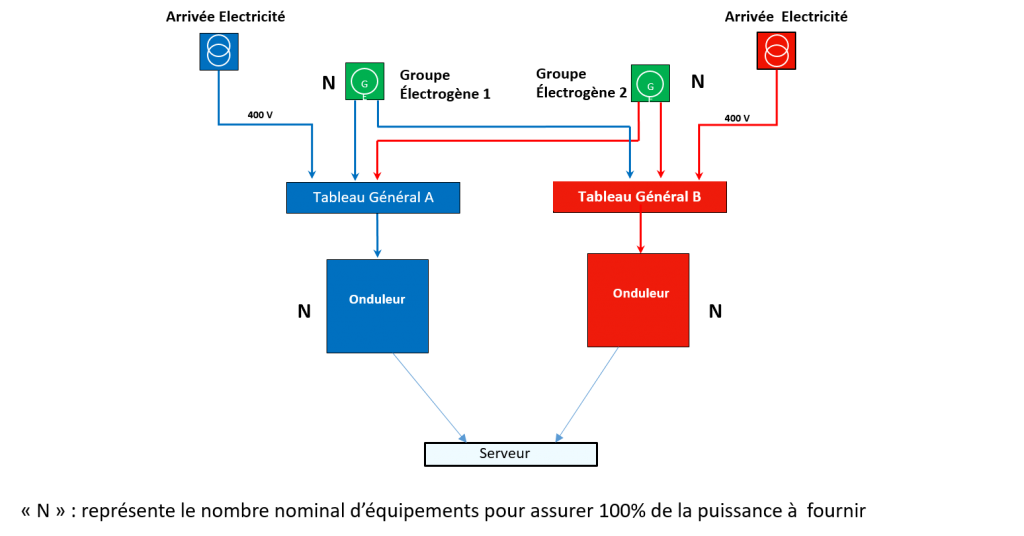 NB : suivant les normes, les groupes électrogènes sont considérés comme la source principale d’énergie du data center. L’énergie provenant des fournisseurs externes n’est qu’une alternative économique.